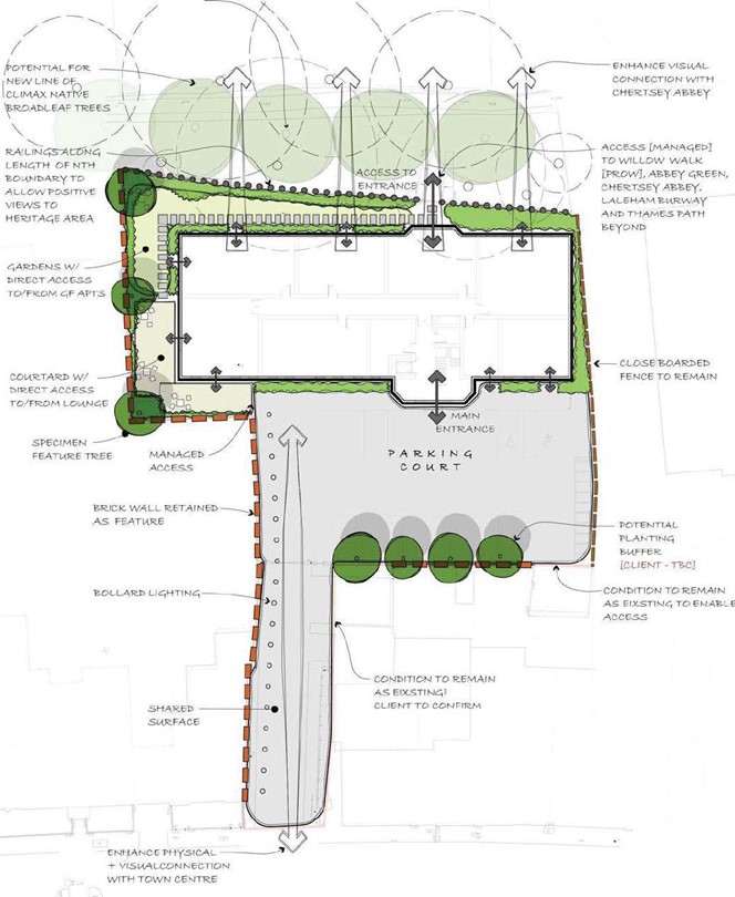- We have started a conversation with Surrey County Council to coordinate access from the rear of the development to the green area north of the scheme in order to generate site permeability for residents.